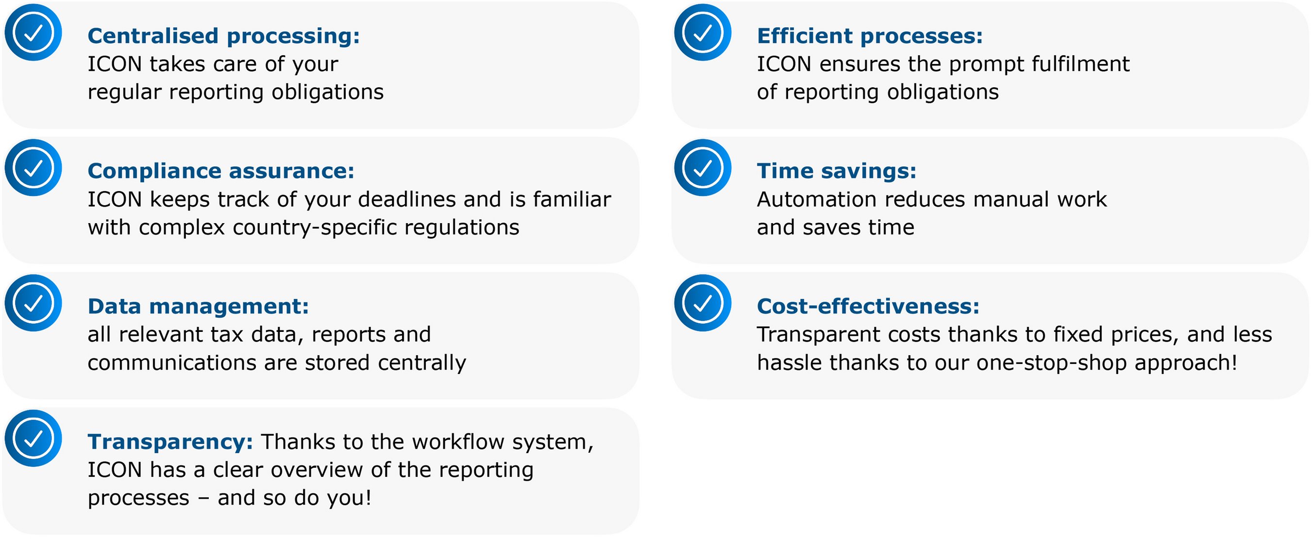 As a one-stop shop for fulfilling your compliance obligations in the EU, we handle the central processing for you – saving you valuable time. “VATify for ICON” already enables us to independently manage VAT, statistical and extended reporting obligations – including digital reporting and e-invoicing in most EU Member States. We would be happy to discuss country-specific details in more depth during a personal meeting.