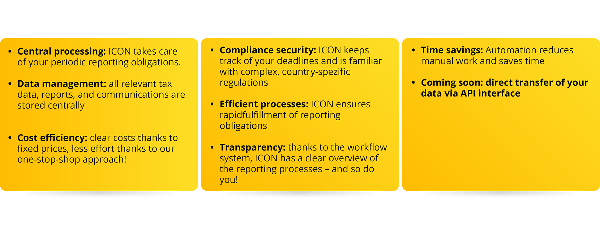 As a one-stop shop for fulfilling your compliance obligations in the EU we take care of the central processing for you—saving you valuable time. "VATify for ICON“ already enables us to independently handle sales tax, statistical, and extended reporting obligations—including digital reporting & e-invoicing in in Belgium, Denmark, Finland, Luxembourg, the Netherlands, Romania, Sweden, Slovakia, Slovenia, and Hungary. We are continuously working to expand our range of services to other countries.