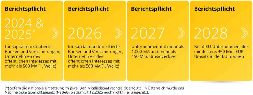 Mit der Richtlinie über die Nachhaltigkeitsberichterstattung (CSRD) wurden die Berichtsplfichten in Bezug auf Nachhaltigkeitsthemen von Unternehmen ausgeweitet. Entsprechend der Richtlinie mussten erste Unternehmen die Verpflichtung bereits ab dem Geschäftsjahr 2024 umsetzen. Da die nationale Umsetzung in Österreich noch nicht finalisiert wurde, wird die Berichtspflicht erst ab dem Geschäftsjahr 2026 eintreten.