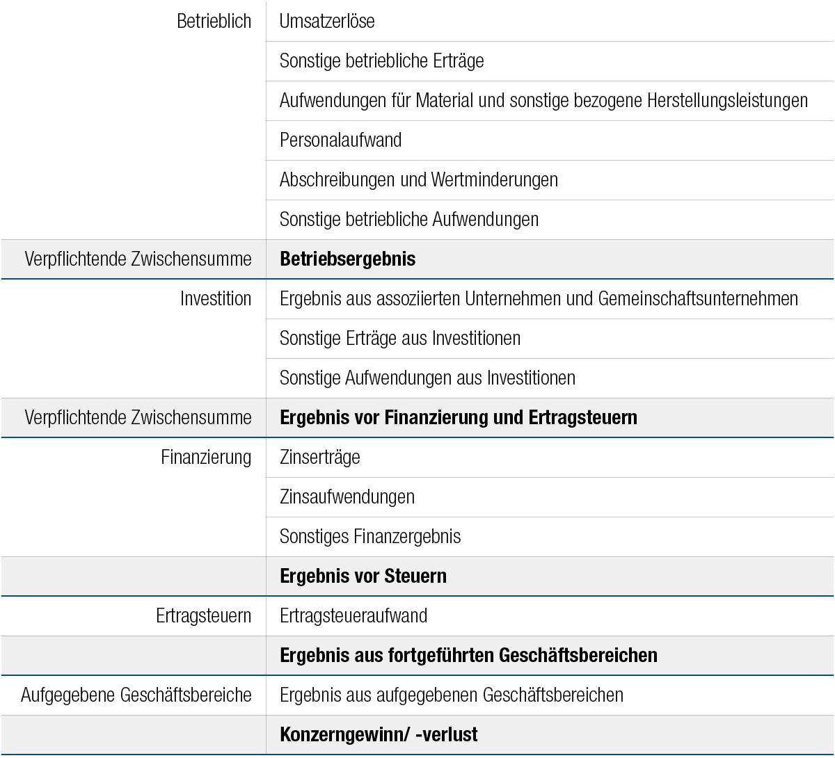 - Ergänzung verpflichtender Zwischensummen in der GuV: “Betriebsergebnis” sowie “Ergebnis vor Finanzierung und Ertragsteuern” werden eingeführt und sind verpflichtend anzugeben.