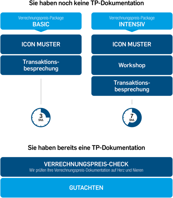 Wenn die ICON Musterdokumentation nicht benötigt wird kann der Workshop auch nach Stundenaufwand abgerechnet werden. Für den nachfolgend Review von Master & Local File kann ein Pauschale vereinbart werden.