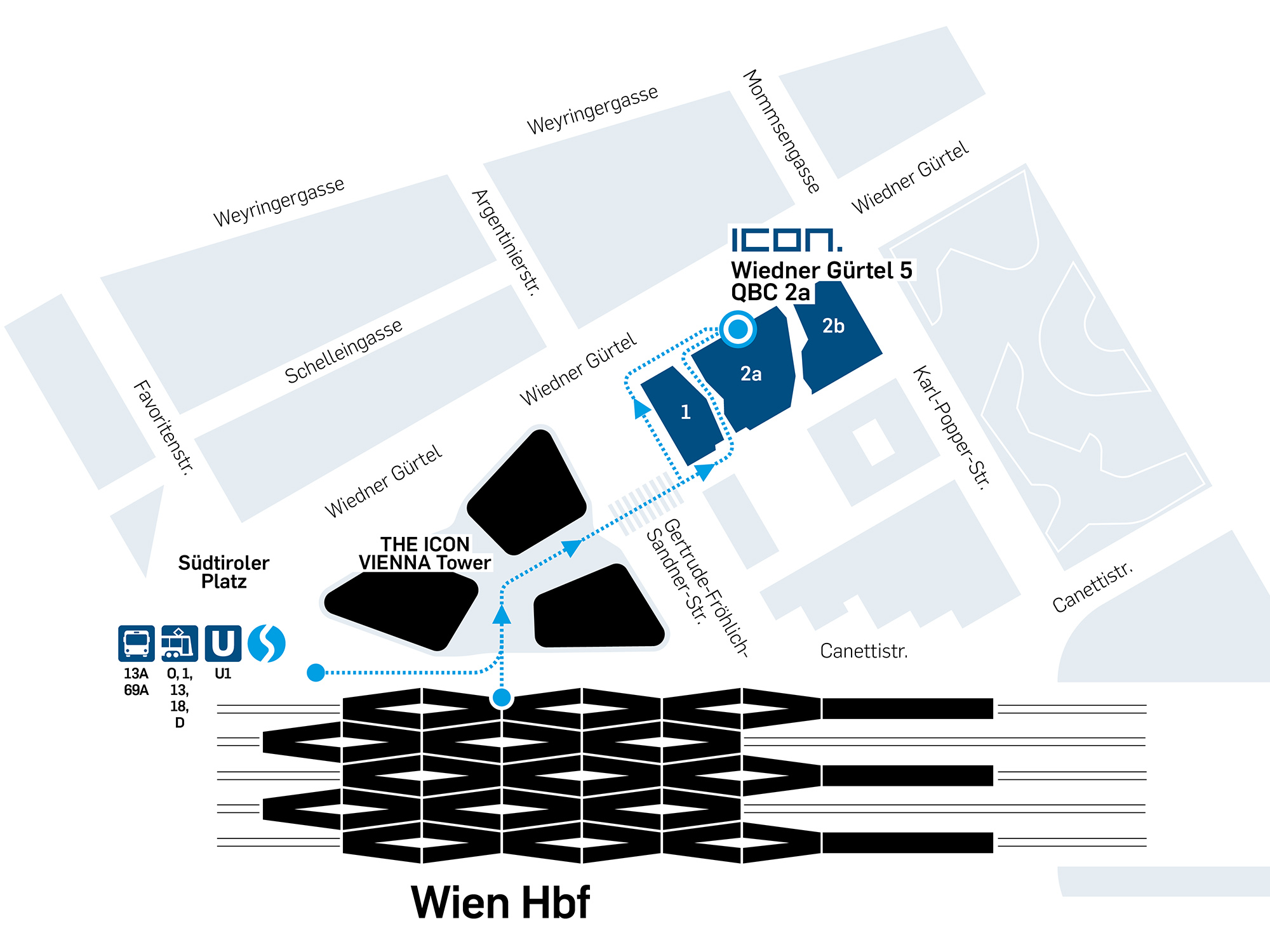 Im dynamischen Business-Hub rund um den Wiener Hauptbahnhof QBC 2a, Wiedner Gürtel 5, 5. Stock, 1100 Wien, schlägt ICON ein neues Kapitel auf. Zukunftsorientiert und global vernetzt – wie schon in Linz verbindet ICON auch am neuen Standort Wien Dynamik, Innovation und Lösungs-Power mit einzigartigem Experten-Know-how.